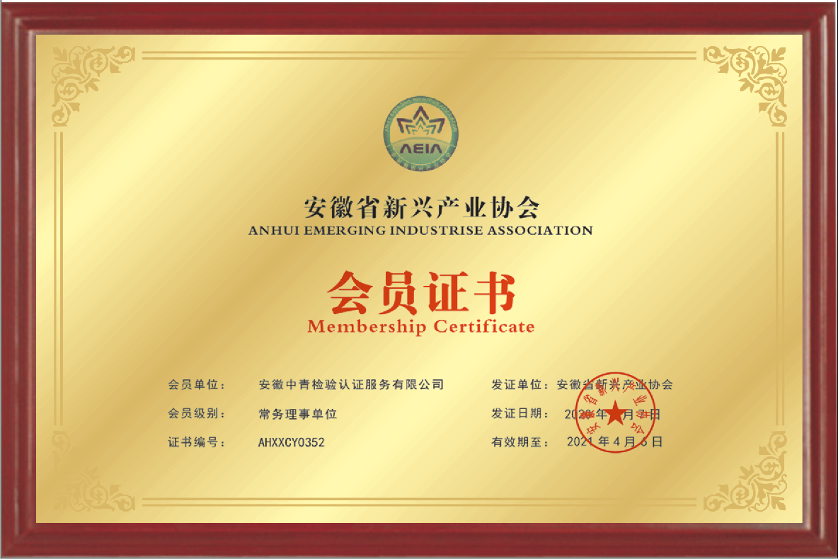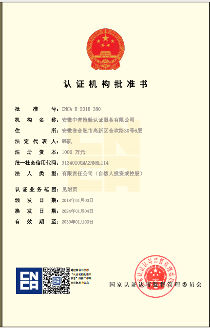 安徽中青檢驗(yàn)認(rèn)證服務(wù)有限公司成立于2017年6月6日,2018年1月3日通過(guò)國(guó)家認(rèn)證認(rèn)可監(jiān)督管理委員會(huì)批準(zhǔn),現(xiàn)認(rèn)證領(lǐng)域:質(zhì)量管理體系、環(huán)境管理體系、職業(yè)健康安全管理體系、食品安全管理體系、HACCP管理體系、有機(jī)產(chǎn)品認(rèn)證、良好農(nóng)業(yè)規(guī)范、服務(wù)體系、醫(yī)療器械質(zhì)量管理體系、企業(yè)誠(chéng)信管理體系、食品工業(yè)企業(yè)誠(chéng)信管理體系、食安安徽品牌等類別認(rèn)證。
